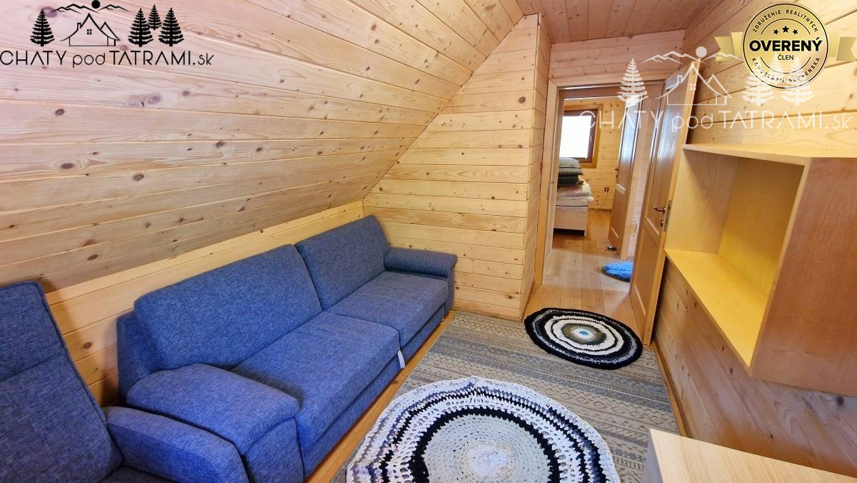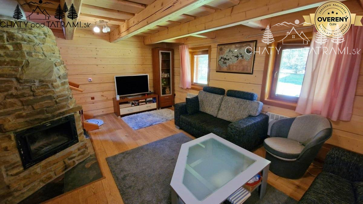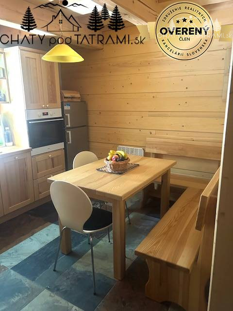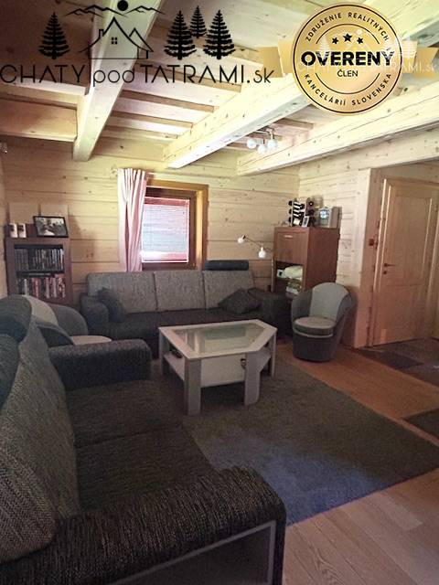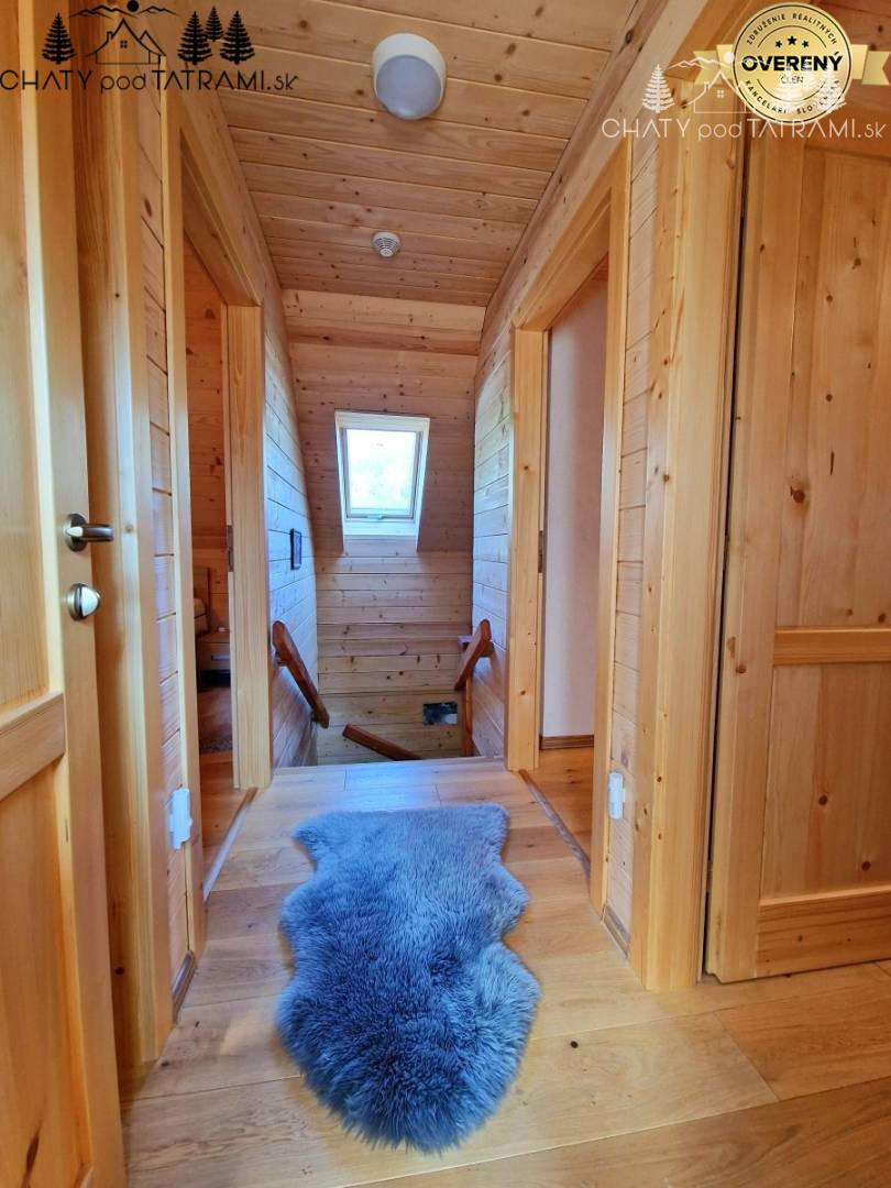 Na prízemí sa nachádza veľká zastrešená terasa, kde si naplno vychutnáte prepojenie s okolitou prírodou. Cez chodbu vstúpite do obývacej izby s krbom obloženým pieskovcom, ktorý dodáva pobytu v drevenici neopakovateľnú atmosféru a poskytuje príjemné sálavé teplo. V plne zariadenej kuchyni má svoje miesto aj jedálenský kút. Na prízemí je situovaná aj kúpeľňa so sprchovým kútom a toaletou. V podkroví prístupnom po veľkoryso riešených drevených schodoch sa nachádzajú štyri samostatné izby a toaleta s umývadlom a práčkou.