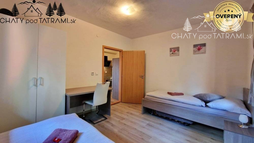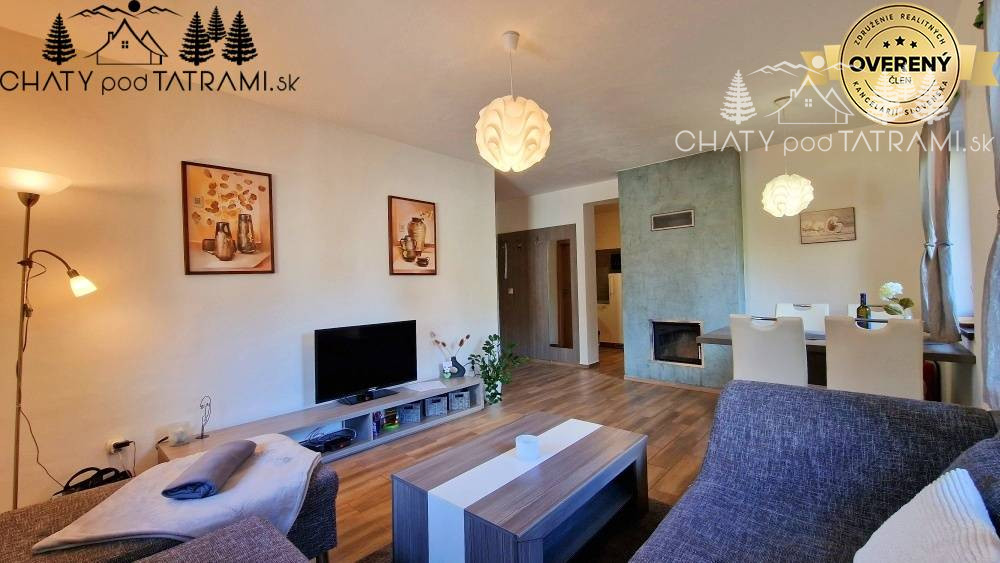 Apartmán je na liste vlastníctva vedený ako byt. Je situovaný na prízemí, v trojposchodovom apartmánovom dome kolaudovanom v roku 2016. Byt je orientovaný na východ, sever a západ, má výmeru 56m2. Nachádza sa tu zádverie, obývacia izba s krbom, kuchyňa s kuchynskou linkou so vstavanými spotrebičmi a jedálenský kút. Ďalej sú tu dve priestranné spálne a kúpeľňa s toaletou. K apartmánu prislúcha parkovacie miesto a odkladacie priestory na prízemí domu. Vykurovanie je riešené elektrickým podlahovým kúrením so smart regulátormi teploty pre každú miestnosť osobitne s ovládaním cez wi-fi. Taktiež je možné spríjemniť si dlhé zimné večeri zakúrením do krbu s teplovzdušnou vložkou, ktorá vykúri celý byt.
