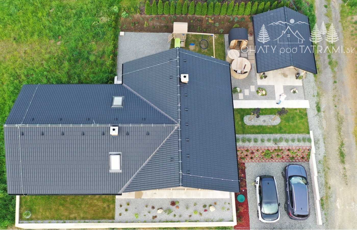 Na pekne upravenom pozemku sa nachádza altánok o rozmeroch 4x5m s uzamykateľným odkladacím priestorom, exteriérová elektrická fínska sauna, ochladzovacia kaďa s možnosťou napúšťania aj v zime cez vonkajší nezamŕzajúci ventil, kúpacia kaďa na tuhé palivo, detské ihrisko, posedenie s ohniskom a parkovisko pre päť áut s 11kW nabíjačkou pre EV.