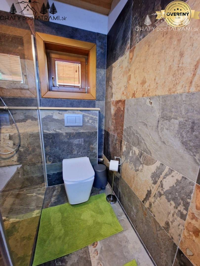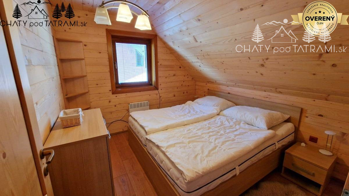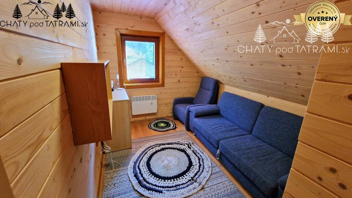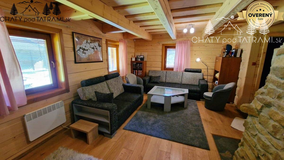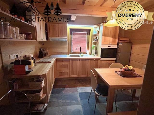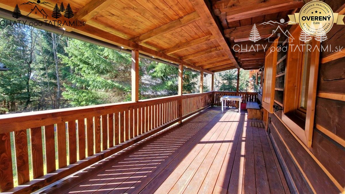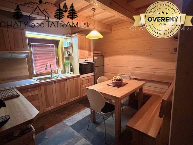 Na prízemí sa nachádza veľká zastrešená terasa, kde si naplno vychutnáte prepojenie s okolitou prírodou. Cez chodbu vstúpite do obývacej izby s krbom obloženým pieskovcom, ktorý dodáva pobytu v drevenici neopakovateľnú atmosféru a poskytuje príjemné sálavé teplo. V plne zariadenej kuchyni má svoje miesto aj jedálenský kút. Na prízemí je situovaná aj kúpeľňa so sprchovým kútom a toaletou. V podkroví prístupnom po veľkoryso riešených drevených schodoch sa nachádzajú štyri samostatné izby a toaleta s umývadlom a práčkou.