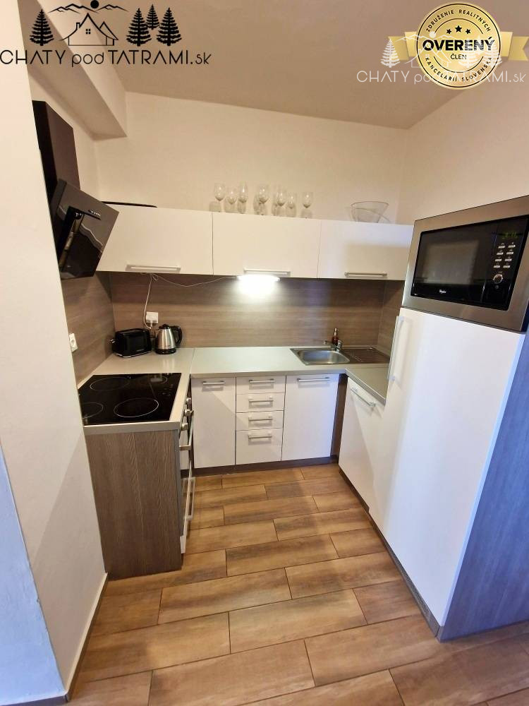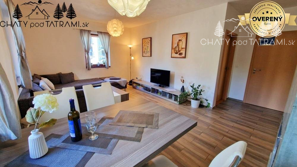 Apartmán je na liste vlastníctva vedený ako byt. Je situovaný na prízemí, v trojposchodovom apartmánovom dome kolaudovanom v roku 2016. Byt je orientovaný na východ, sever a západ, má výmeru 56m2. Nachádza sa tu zádverie, obývacia izba s krbom, kuchyňa s kuchynskou linkou so vstavanými spotrebičmi a jedálenský kút. Ďalej sú tu dve priestranné spálne a kúpeľňa s toaletou. K apartmánu prislúcha parkovacie miesto a odkladacie priestory na prízemí domu. Vykurovanie je riešené elektrickým podlahovým kúrením so smart regulátormi teploty pre každú miestnosť osobitne s ovládaním cez wi-fi. Taktiež je možné spríjemniť si dlhé zimné večeri zakúrením do krbu s teplovzdušnou vložkou, ktorá vykúri celý byt.