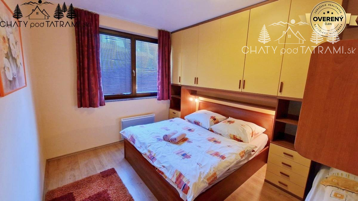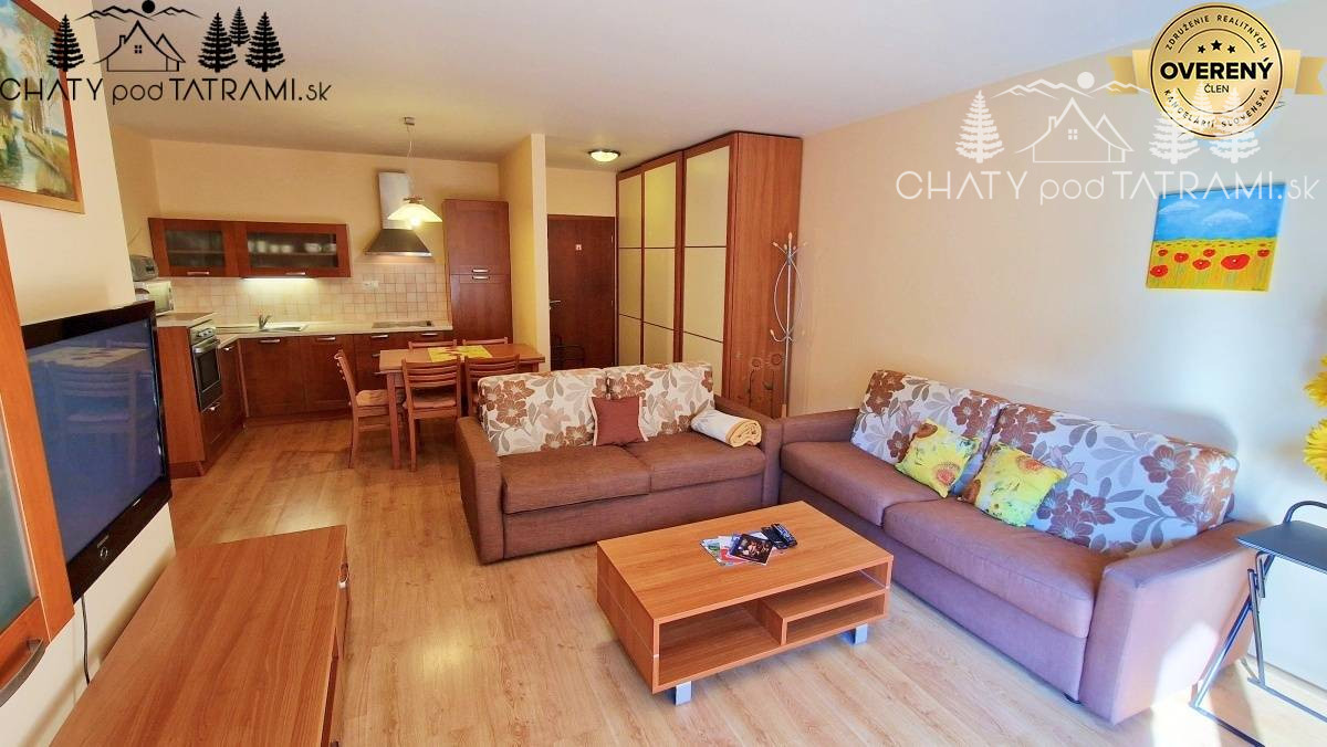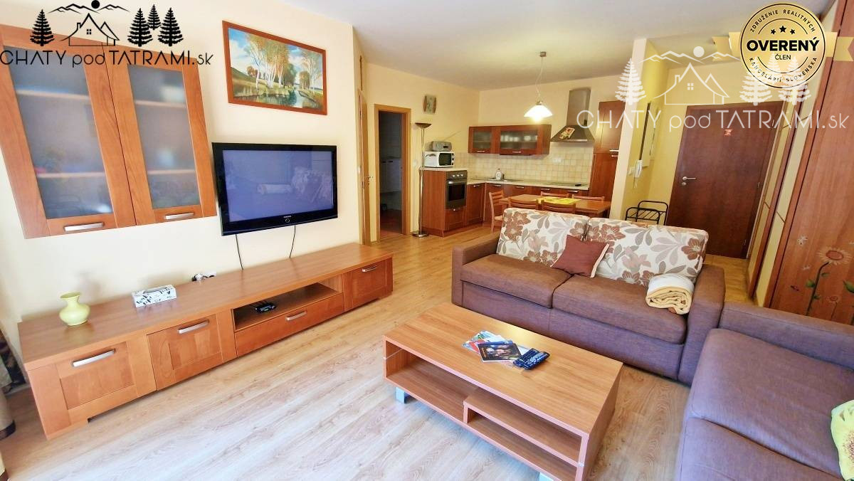 Interiér apartmánu zahŕňa zádverie so vstavanou skriňou, priestrannú obývaciu izbu, kuchyňu s modernou kuchynskou linkou a vstavanými spotrebičmi, jedálenský kút, spálňu s manželskou posteľou, poschodovou posteľou a odkladacími priestormi. Byt je zariadený na mieru vyrobeným kvalitným nábytkom. Z obývačky je priamy východ na slnečnú terasu s výhľadom na okolitú prírodu. K apartmánu patrí parkovacie miesto v garáži na prízemí, ktoré je súčasťou predaja. Vykurovanie je zabezpečené elektrickými konvektormi a podlahovým vykurovaním s rebríkovým radiátorom v kúpeľni.