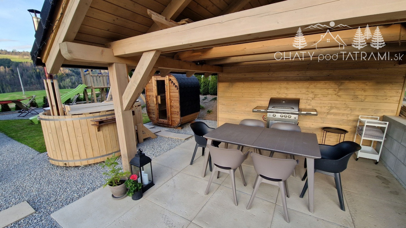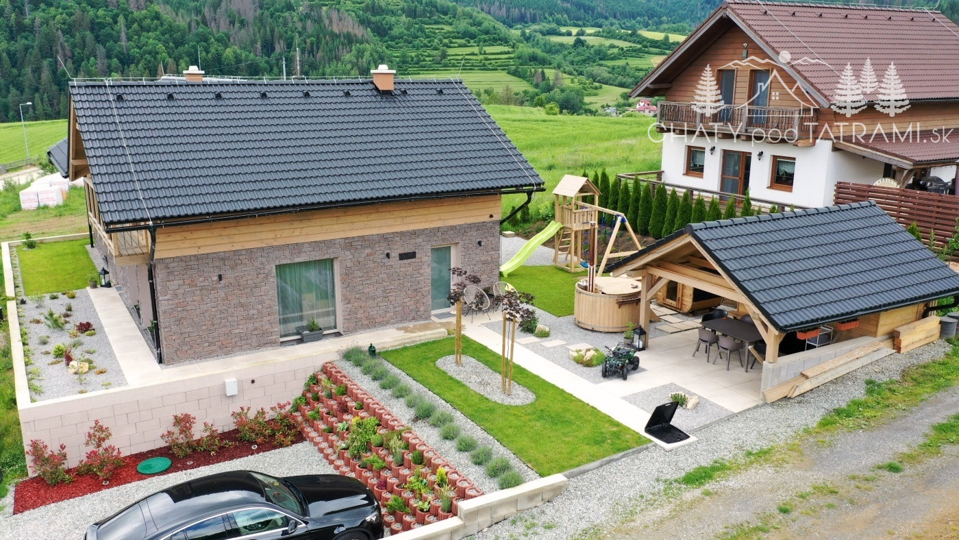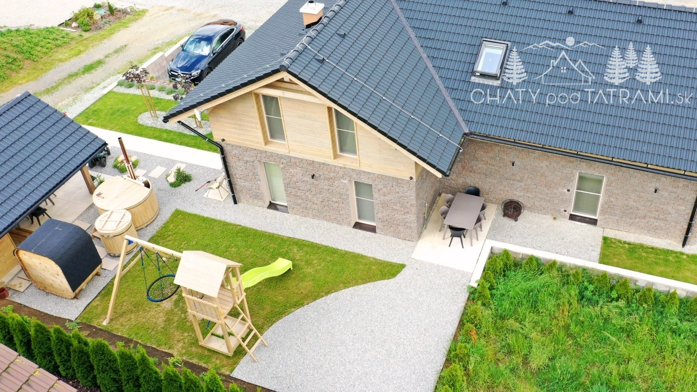 Na pekne upravenom pozemku sa nachádza altánok o rozmeroch 4x5m s uzamykateľným odkladacím priestorom, exteriérová elektrická fínska sauna, ochladzovacia kaďa s možnosťou napúšťania aj v zime cez vonkajší nezamŕzajúci ventil, kúpacia kaďa na tuhé palivo, detské ihrisko, posedenie s ohniskom a parkovisko pre päť áut s 11kW nabíjačkou pre EV.